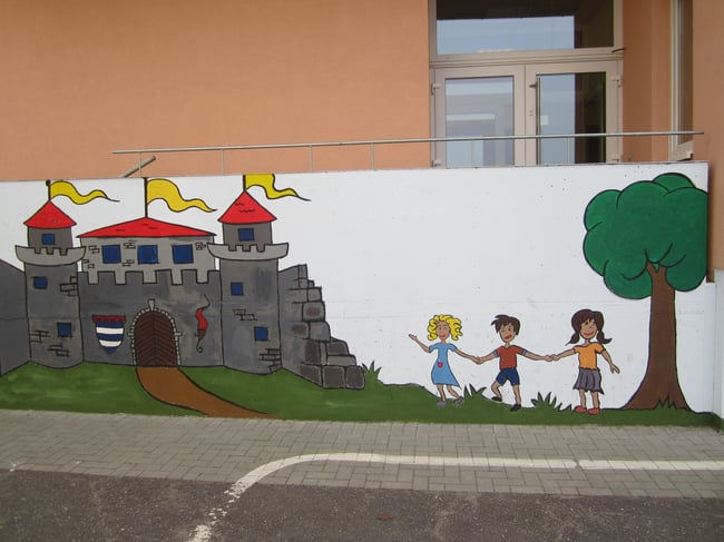 Im Mai 2013 wurde in einer gemeinsamen Aktion von Eltern und Schülern die graue Wand zum Kindergarten hin bemalt.