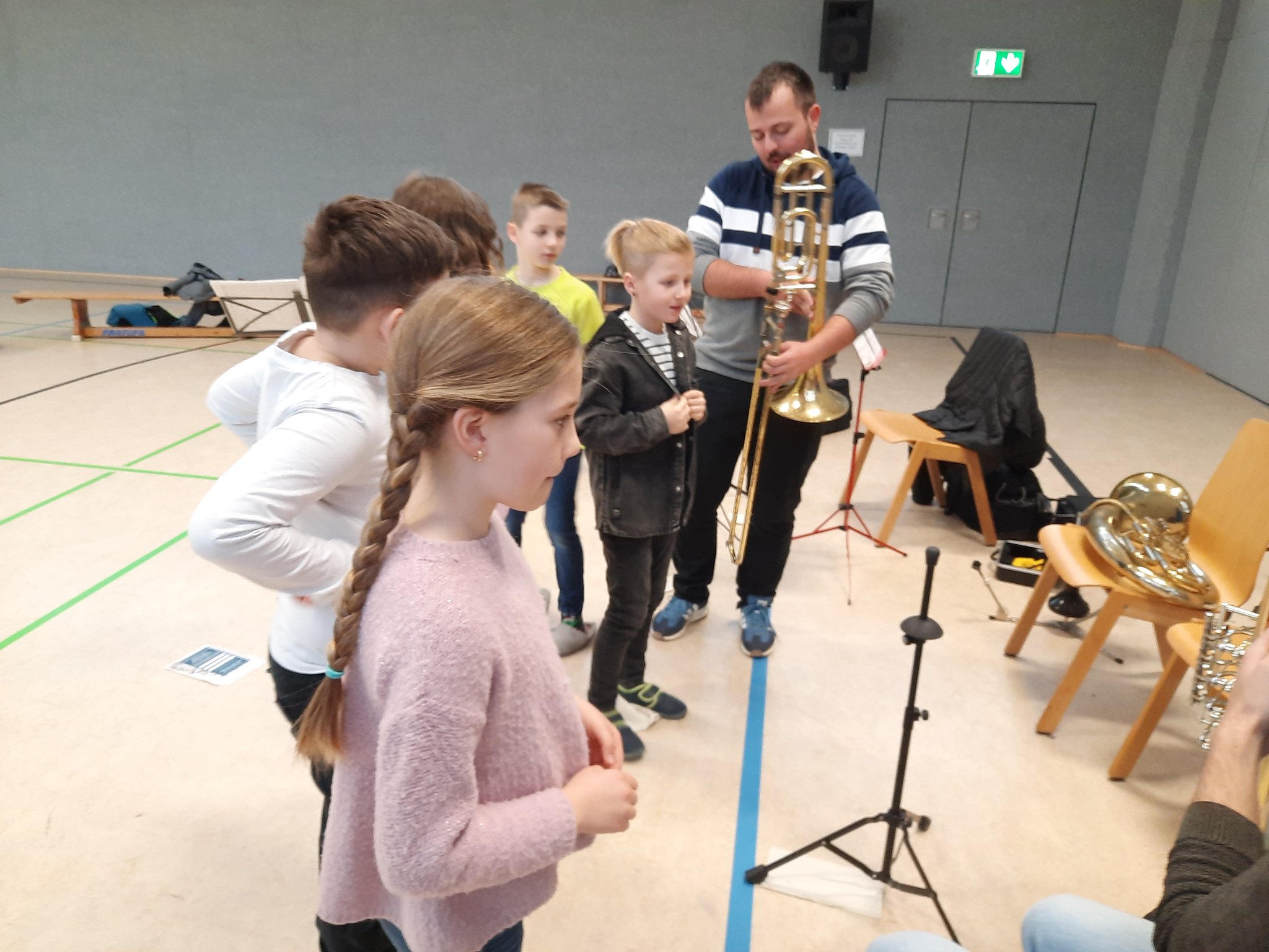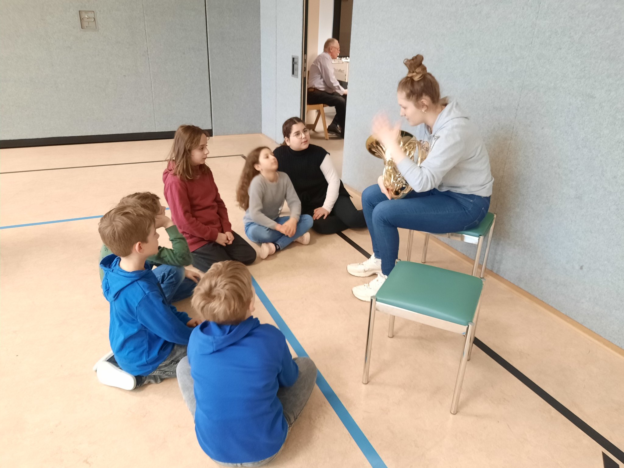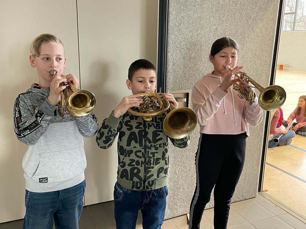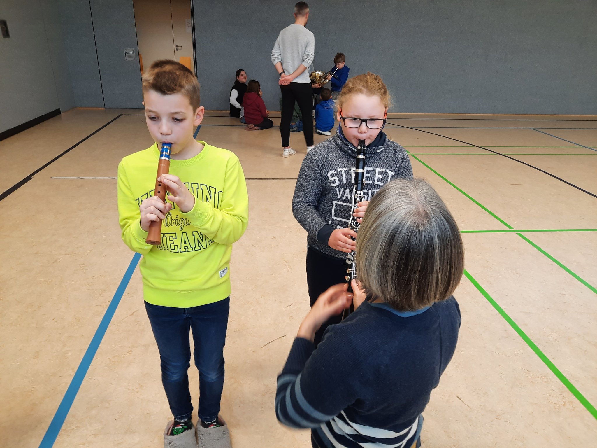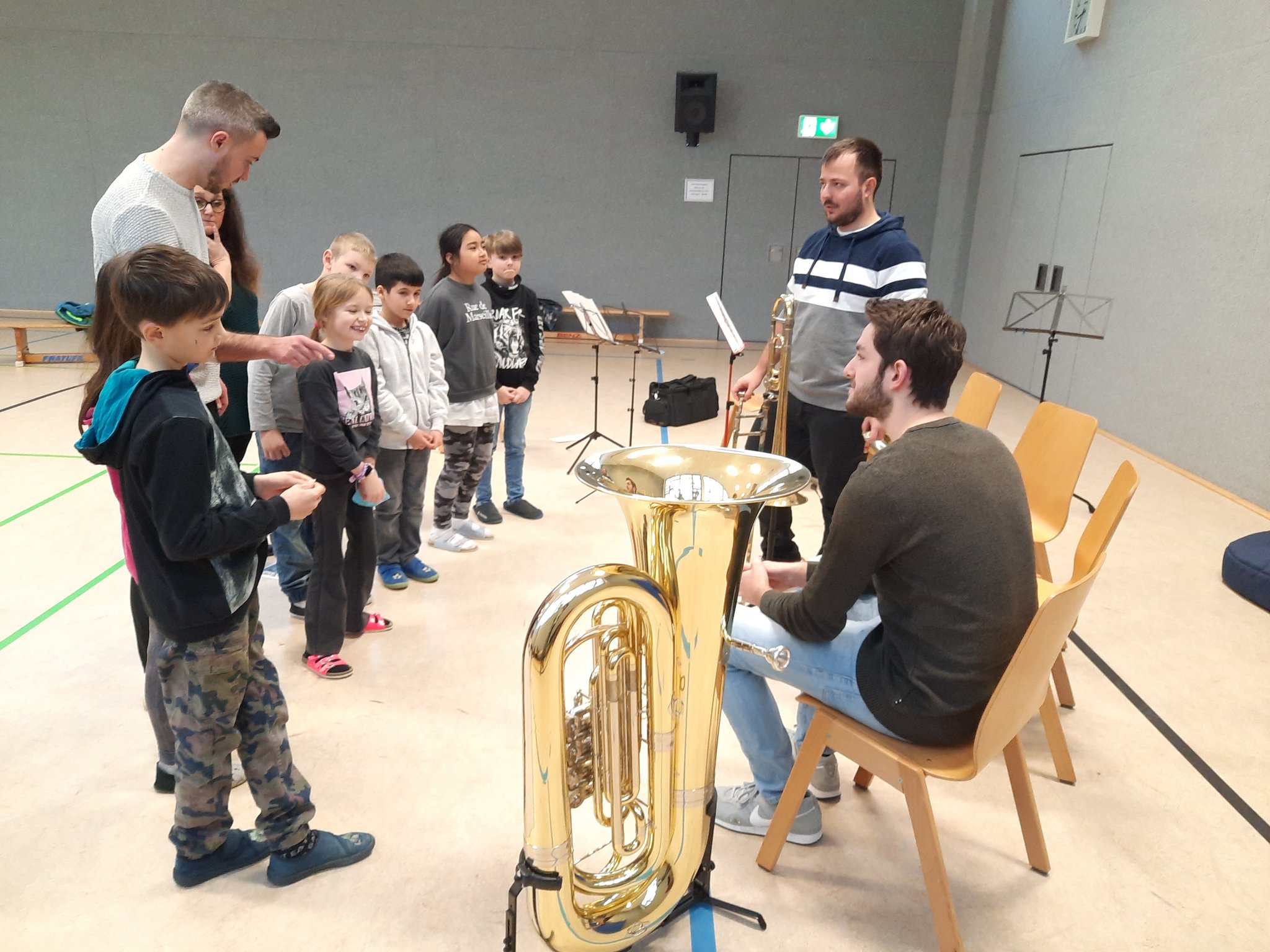 An zwei Tagen im März stellten der Musikverein St. Michael, Weingarten, den Dritt- und Viertklässlern ihre Instrumente vor. Zur Begrüßung bekamen die Schüler zwei Stücke vorgespielt und durften auch durch rhythmisches Klatschen begleiten. In vier Gruppen eingeteilt konnten sie die Instrumente näher kennenlernen und ausprobieren: Trompete, Horn, Klarinette, Tuba, Posaune, Schlagzeug, ...