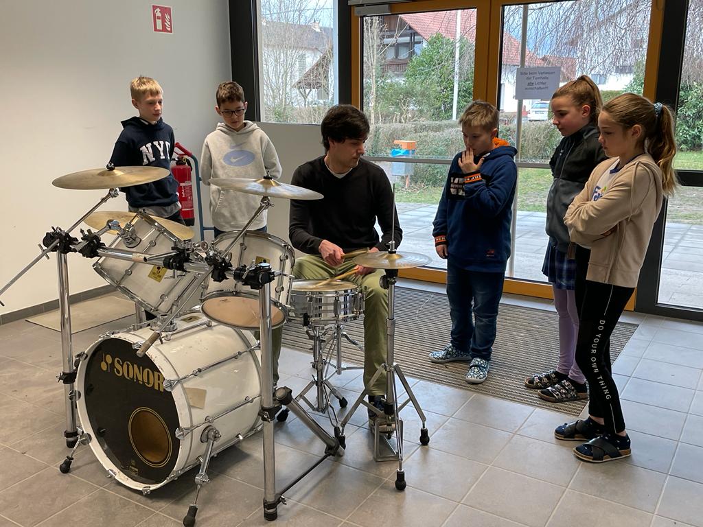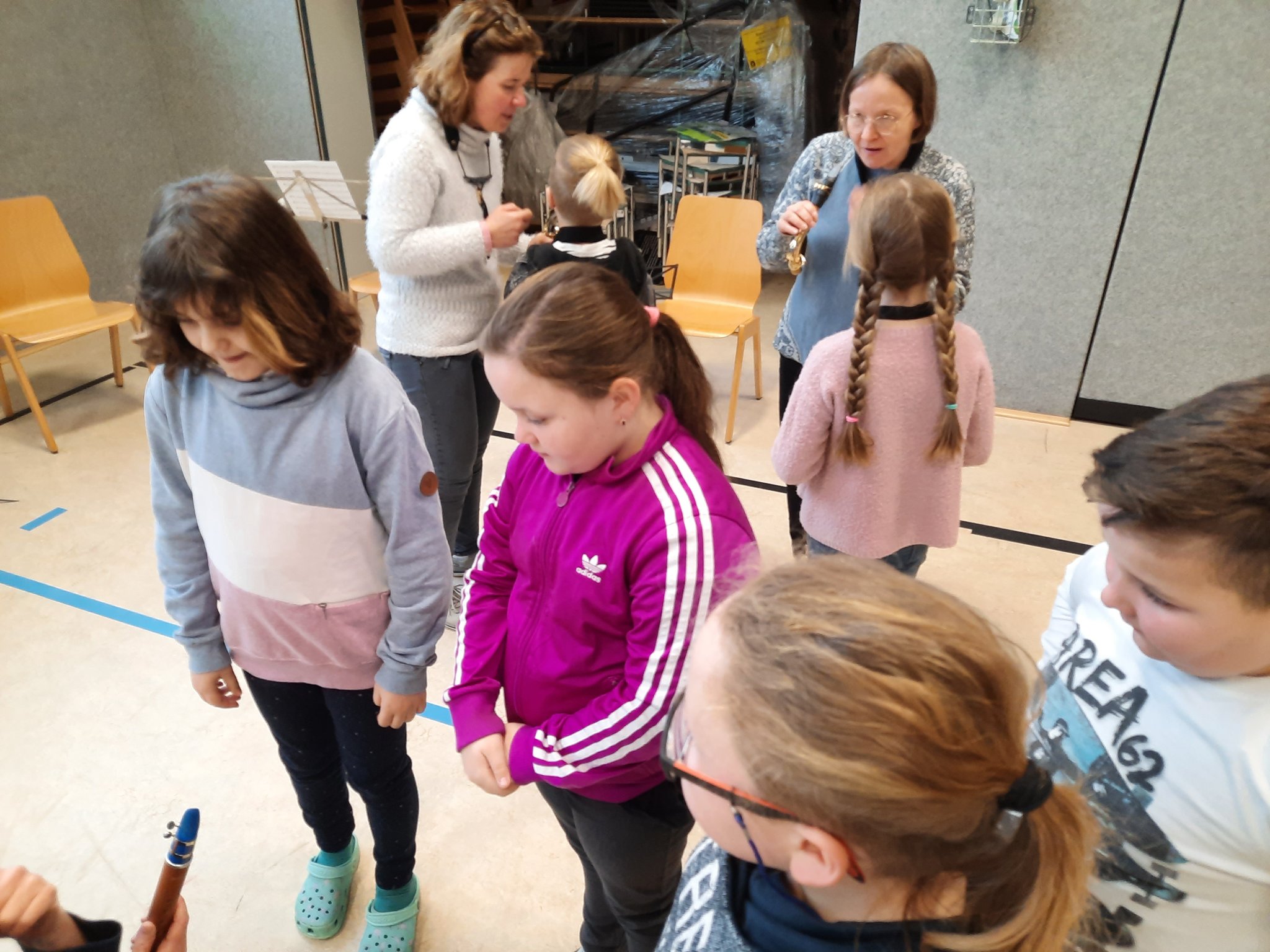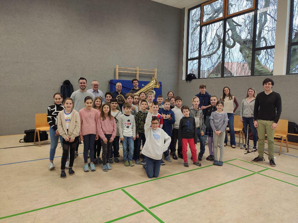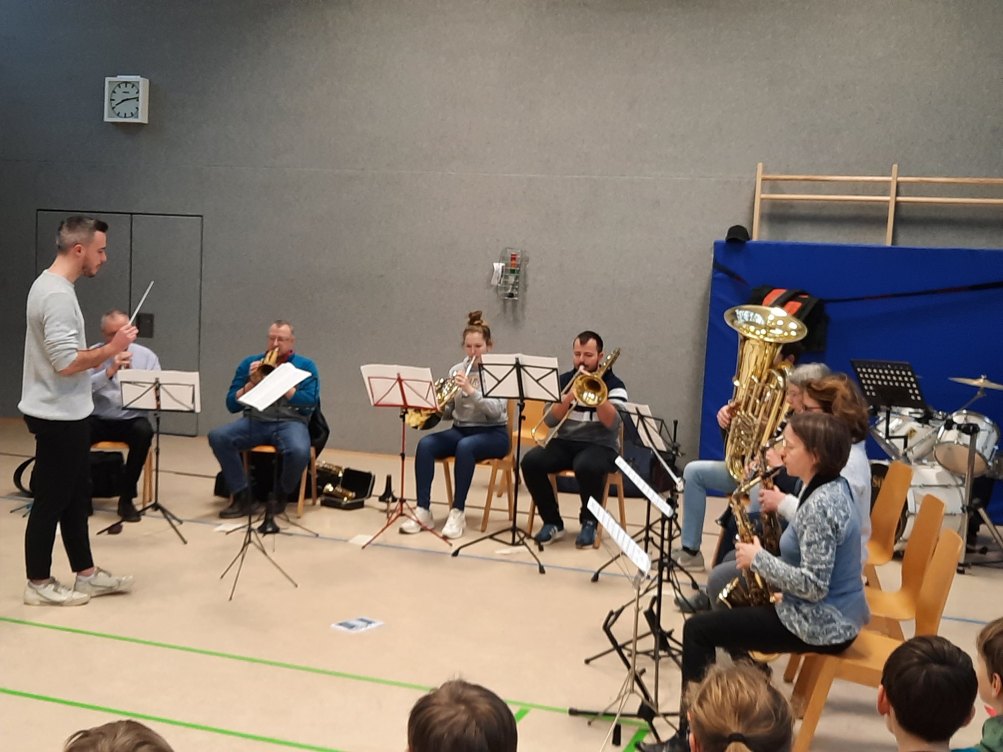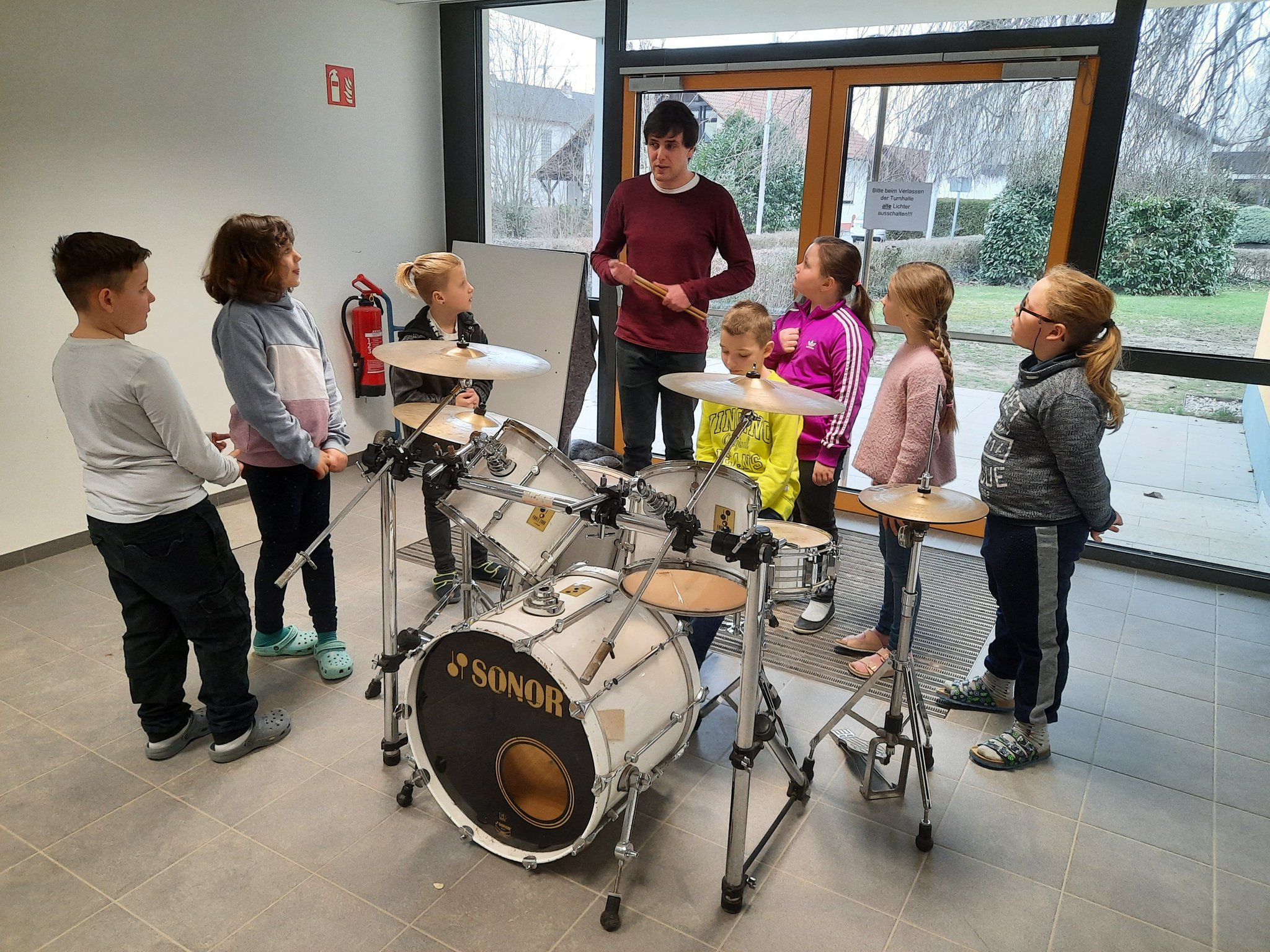 An zwei Tagen im März stellten der Musikverein St. Michael, Weingarten, den Dritt- und Viertklässlern ihre Instrumente vor. Zur Begrüßung bekamen die Schüler zwei Stücke vorgespielt und durften auch durch rhythmisches Klatschen begleiten. In vier Gruppen eingeteilt konnten sie die Instrumente näher kennenlernen und ausprobieren: Trompete, Horn, Klarinette, Tuba, Posaune, Schlagzeug, ...