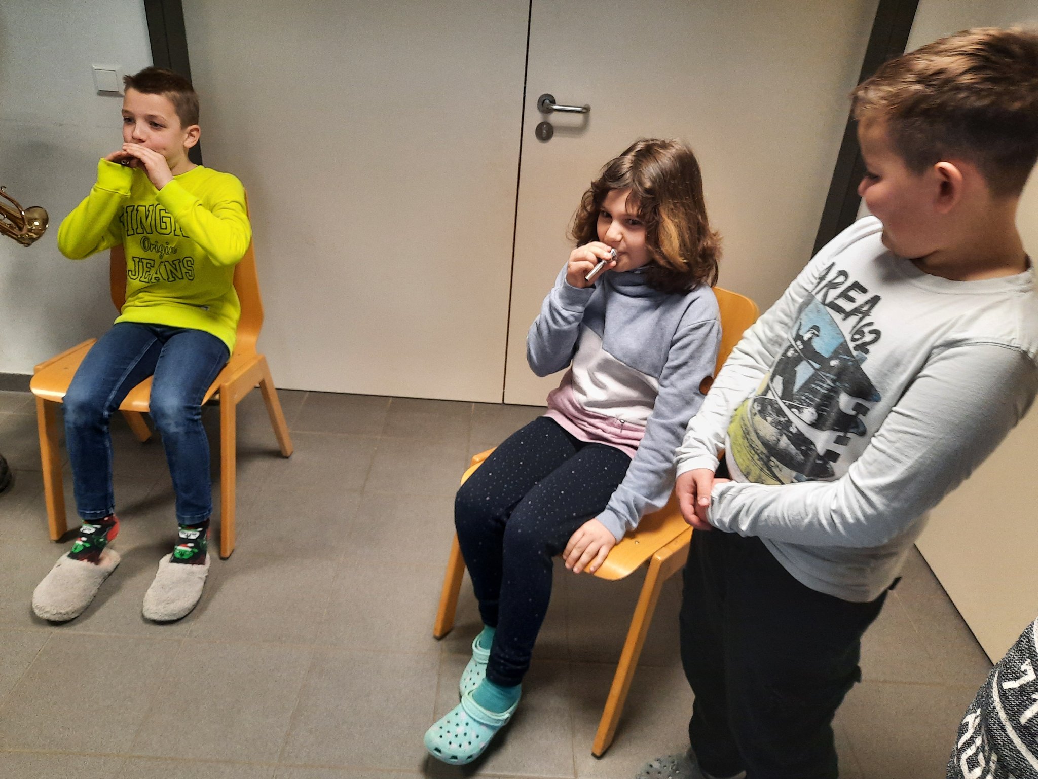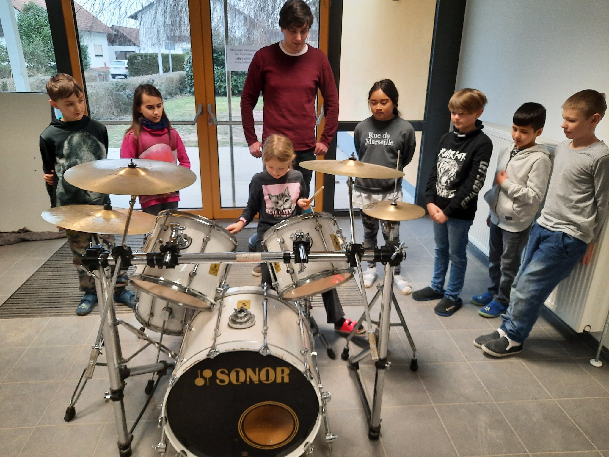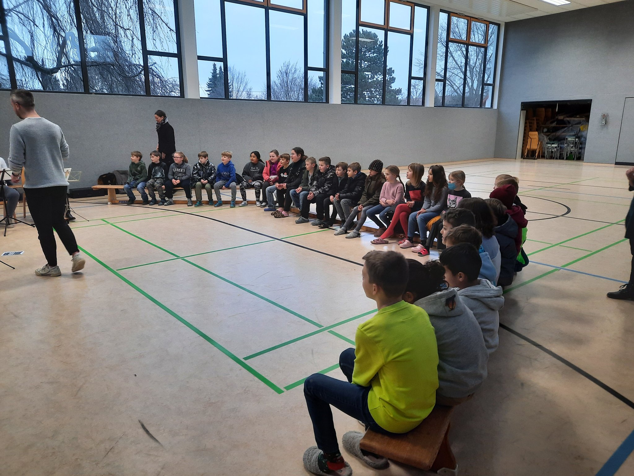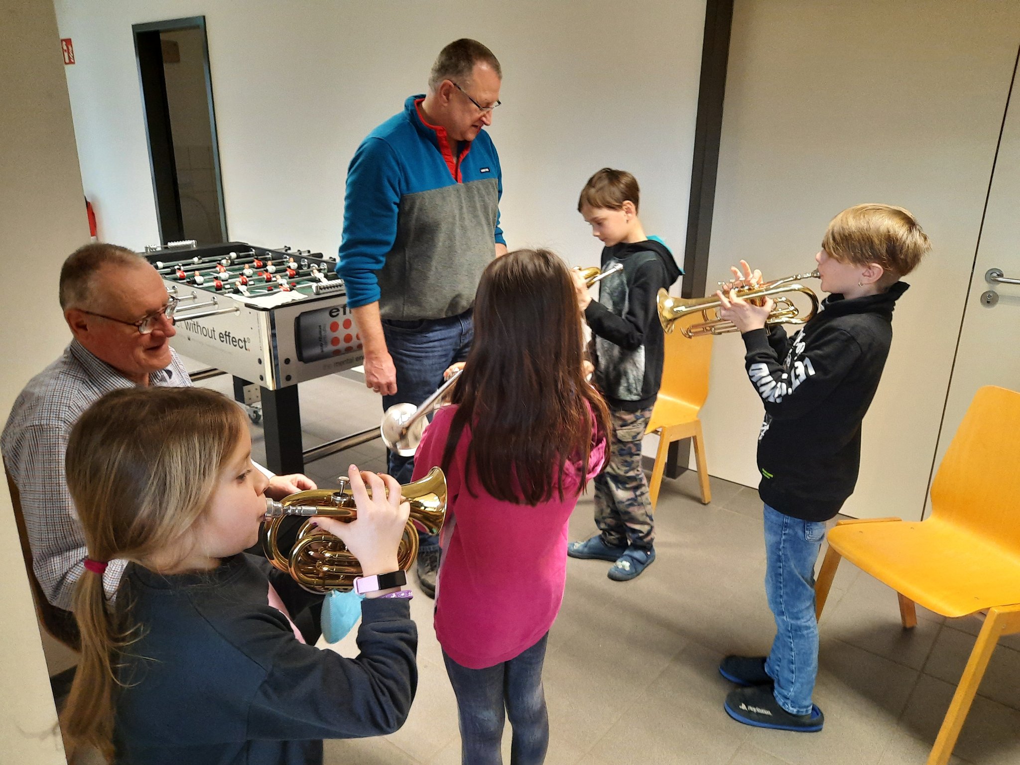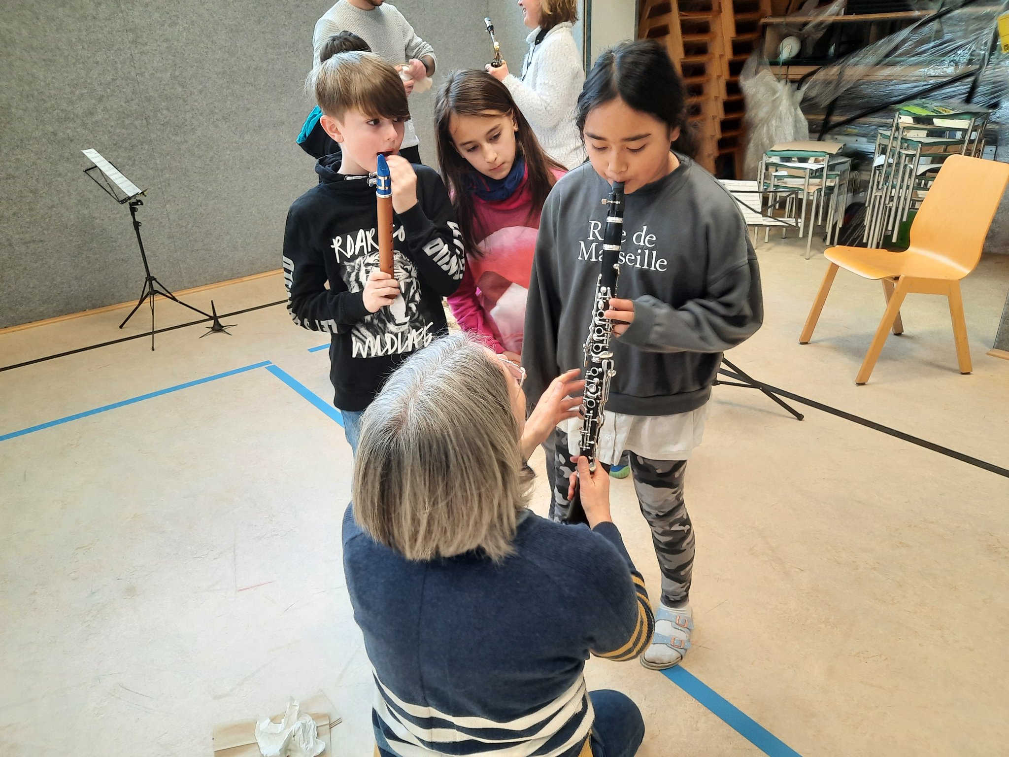 An zwei Tagen im März stellten der Musikverein St. Michael, Weingarten, den Dritt- und Viertklässlern ihre Instrumente vor. Zur Begrüßung bekamen die Schüler zwei Stücke vorgespielt und durften auch durch rhythmisches Klatschen begleiten. In vier Gruppen eingeteilt konnten sie die Instrumente näher kennenlernen und ausprobieren: Trompete, Horn, Klarinette, Tuba, Posaune, Schlagzeug, ...