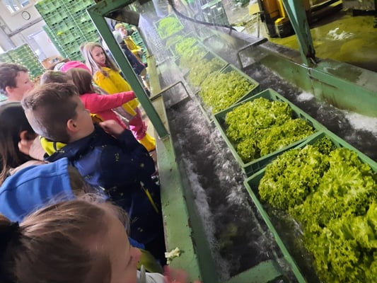 In der Halle durften wir die Salatkisten etikettieren und bei der Salatwaschung zuschauen. Zum Abschluss gab es Brezeln zur Stärkung für den Heimweg.