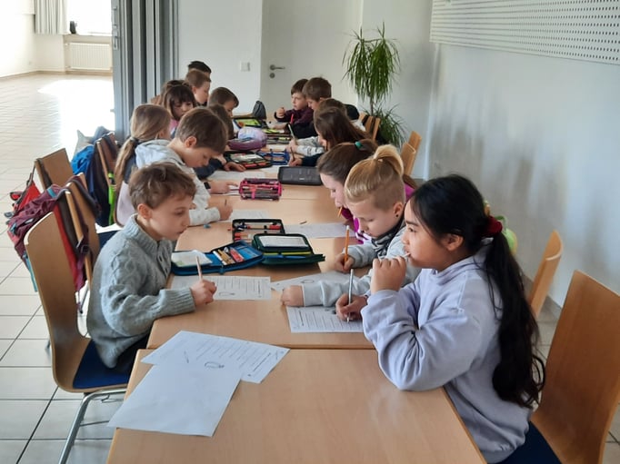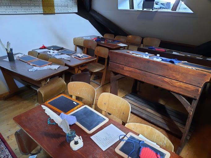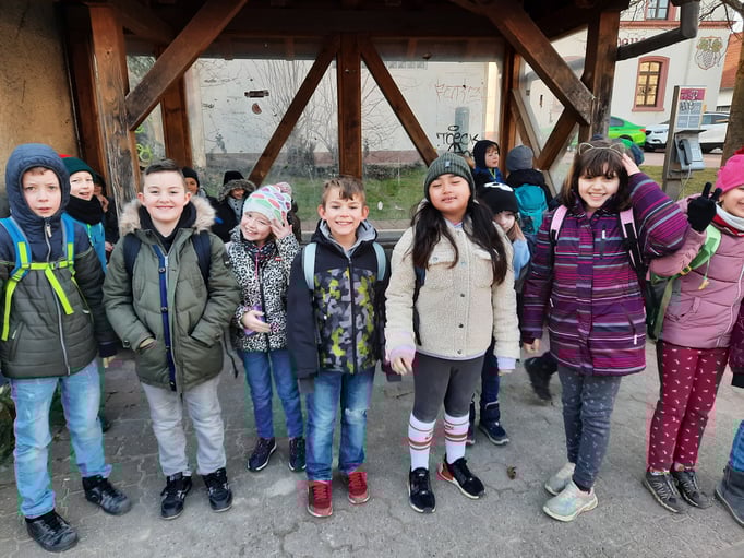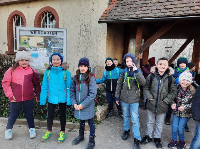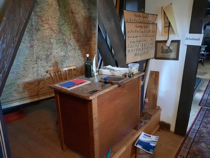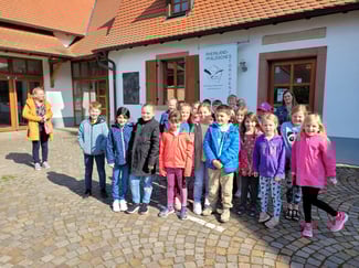Anfang März fuhren wir (die dritten Klassen) mit dem Bus nach Schwegenheim. Dort bildeten wir zwei Gruppen. Nacheinander gingen wir nach oben in das Dachgeschoss, wo es viel zu sehen gab. Besonders toll für uns war der alte Schulsaal. Frau Kerner erzählte uns einiges über die Schule früher. Unten durften wir mit einer Feder, einem Federhalter und Tinte schreiben. Zum Schluss wanderten wir zurück zur Schule.
